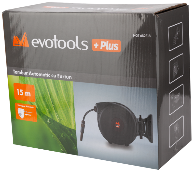 Tamburul automat pentru furtun EVOTOOLS PLUS permite depozitarea si transportul in siguranta a furtunului de gradina. Carcasa robusta a tamburului de furtun il protejeaza impotriva deteriorarilor mecanice, precum si a conditiilor meteorologice, astfel incat nu trebuie sa va faceti griji cu privire la schimbarea anotimpului sau a vremii, castigati confort si economisiti timp.Retractorul automat va permite sa ascundeti si sa scoateti furtunul rapid si in siguranta si sa il blocati intr-o pozitie care va convine. Tip: