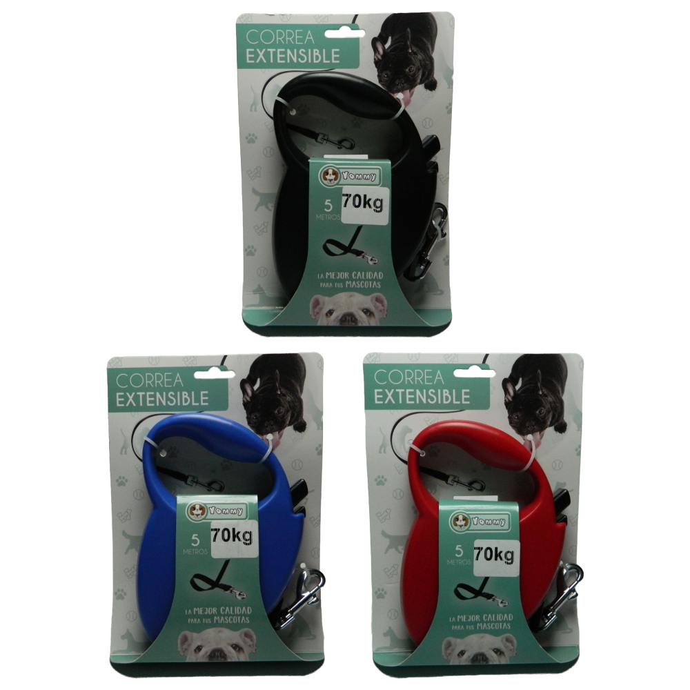 Lesa retractabila marca Yommy cu actiune pe banda textila de inalta rezistenta. Se ruleaza si deruleaza cu o singura mana, are o forma atractiva fiind foarte comoda la folosire. Este destinata animalelor de talie mare de pana la 70kg, avand o lungime maxima de 5m.