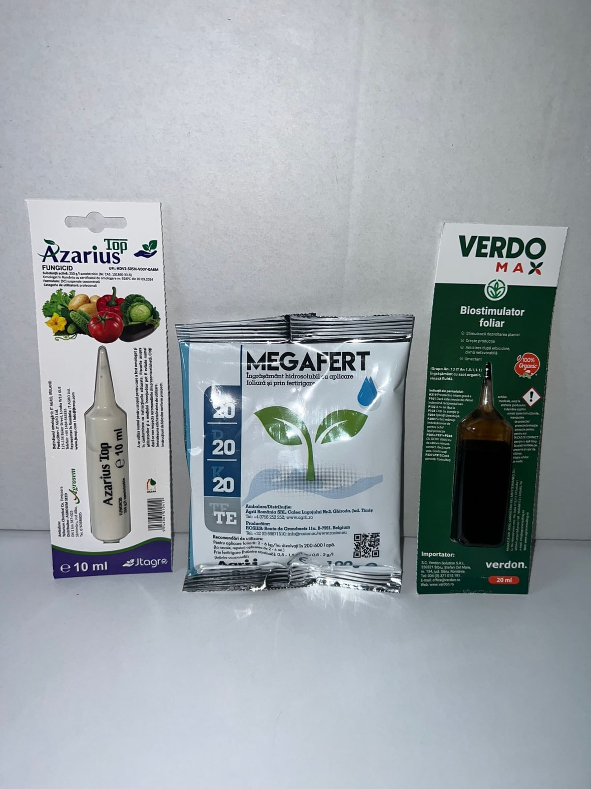 - Primul produs, AZARIUS TOP 10ML, este un fungicid care are ca substanta activa 250 g/l azoxistrobin, fiind destinat pentru a preveni si combate cele mai frecvente boli cum ar fi Rugini, Fainare, Alternarioza, Septorioza, Albumeala cruciferelor, Patarea frunzelor, Antracnoza, Patarea purpurie. Acest fungicid actioneaza la nivelul frunzelor, substanta activa distribuindu-se uniform, iar ceea ce ramane la suprafata se va depozita sub forma unui rezervor pe frunza si se va reactiva in conditii de umiditate ridicata.