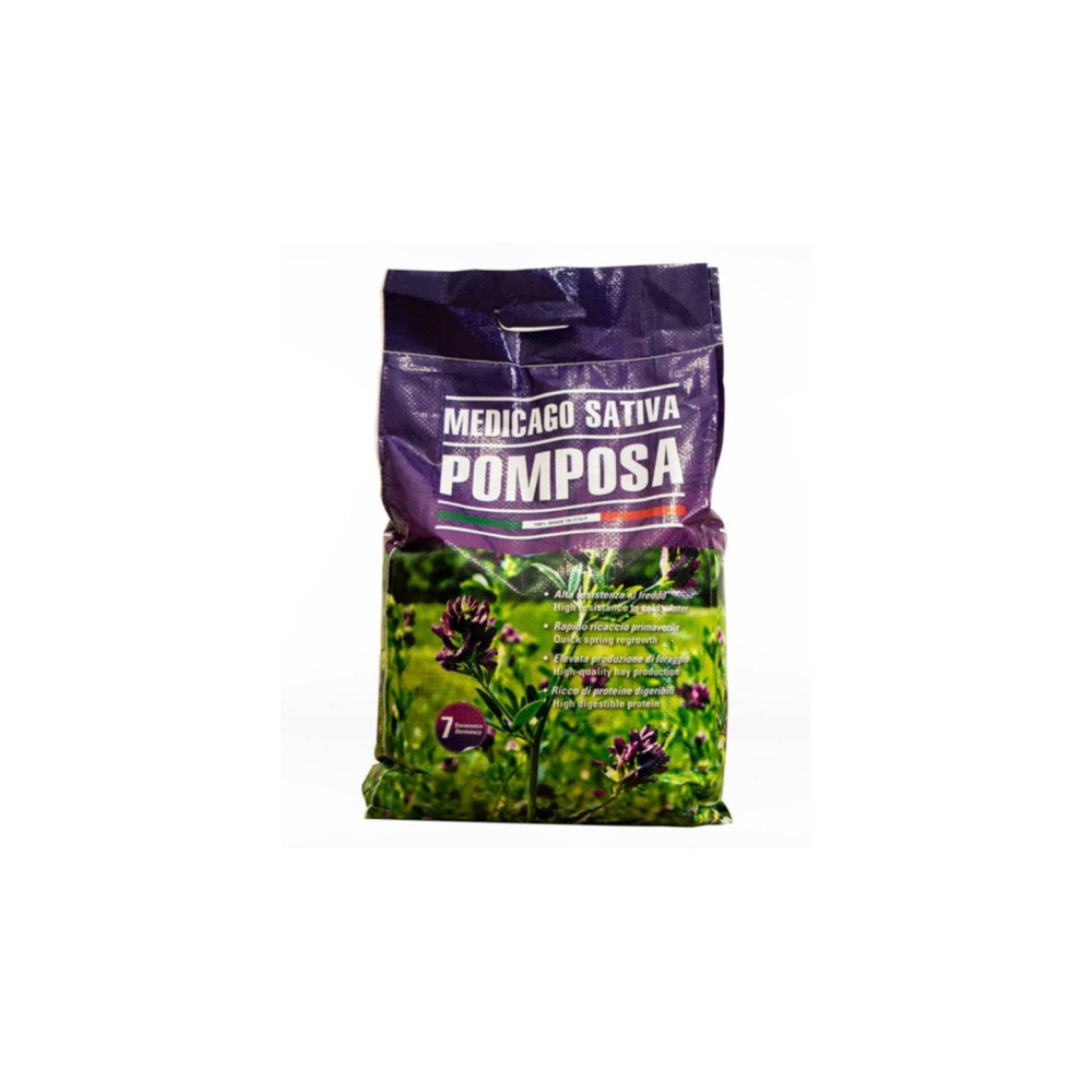 Seminte de Lucerna Pomposa este o varianta cu rezistenta foarte buna pe timpul iernii si o rezistenta deosebita la uzura. Varietatea Pomposa este o varietate de lucerna cu radacini puternice, cu port erect si rezistenta ridicata la cadere. Semintele de lucerna Pomposa au un randament ridicat al culturii, astfel produc un furaj de cea mai buna calitate, cu continut ridicat de proteina si digestibilitate buna. Varietatea, seminte de lucerna Pomposa prezentata poate rezista pana la 4 ani in sol si ofera 4 cosiri pe an, avand un potential de productie de 16-17 tone/hectar, materie uscata. Semintele de lucerna Pomposa este reprezentata astfel: frunzele de forma ovala (lungi si late), cu tulpina subtire, care, in momentul inforirii este lunga, cu raport ridicat de frunze/tulpina. Perioada de inflorire a soiului Pomposa este una medie. Avantajul cultivarii semintelor de lucerna Pomposa este dat de talia plantei, foarte inalta, in a 3-a saptamana de la prima coasa este de aproximativ 49 de centimetri. Semintele de lucerna Pomposa este adaptata pentru toate tipurile de teren, fiind indicata chiar si pe solurile lipsite de apa. Soiul Pomposa are o rezistenta deosebita la cadere si un continut ridicat de proteina. Semintele de lucerna Pomposa se preteaza cosirilor dese, datorita regenerarii rapide de dupa cosire.
