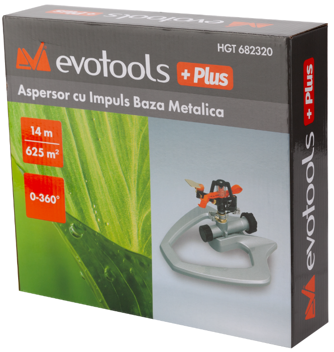 Aspersorul cu Impuls cu Baza Metalica Evotools PLUS, este un aspersor cu care puteti iriga suprafete de pana la 625 mp. Acesta elibereaza apa sub forma de jet cu impuls, avand rotatia de 360 de grade.