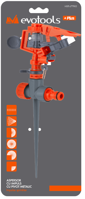 Aspersorul cu Impuls cu Pivot Metalic PLUS este realizat din material plastic rezistent la distrugere (ABS). Acesta permite stropirea suprafetelor de pana la 395 m2 la o presiune de lucru cuprinsa intre 2-4 bar, avand o raza de stropire de 11.2 m si un debit maxim de 8 L/min.
