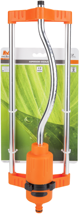 Aspersorul Oscilant cu 17 Duze ETS este realizat din material plastic rezistent la distrugere (ABS) si componente metalice. Acesta permite stropirea suprafetelor de aproximativ 273 m2 (21m*13m) la o presiune de lucru cuprinsa intre 2-4 bar, avand un debit maxim de 22 L/min.