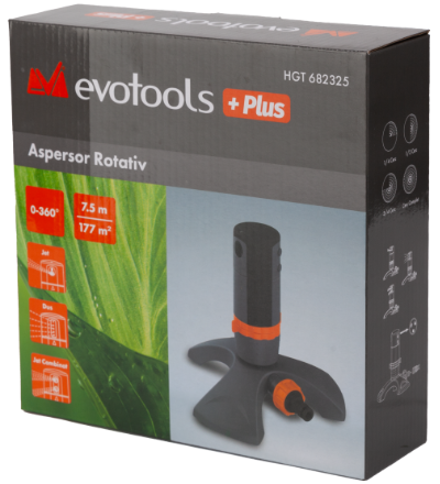 Aspersorul rotativ 2014 Evotools Plus este un aspersor cu ajutorul caruia puteti iriga suprafete de pana la 177 mp, avand o raza maxima de lucru de 7.5 m. Acesta poate iriga in 3 moduri: jet, dus si jet combinat.