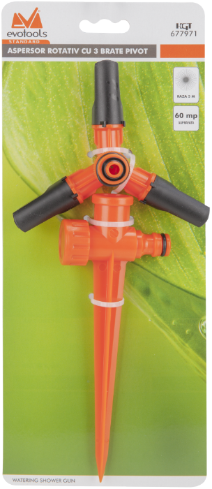 Aspersorul Rotativ cu 3 Brate Pivot ETS este realizat din material plastic rezistent la distrugere (ABS). Acesta permite stropirea suprafetelor de pana la 191 m2 la o presiune de lucru cuprinsa intre 2-4 bar, avand o raza de stropire de 7.8 m si un debit maxim de 26 L/min.