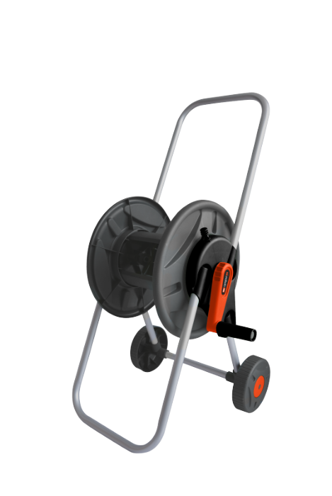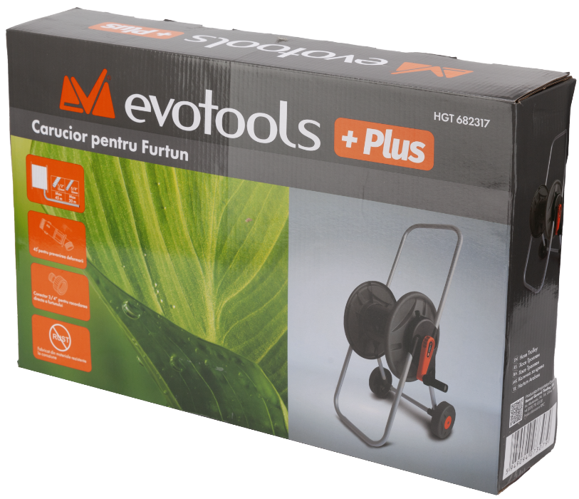 Caruciorul 2014 Evotools este util pentru depozitarea furtunului de gradina, simplu de montat si usor de transportat fiind dotat cu roti.
